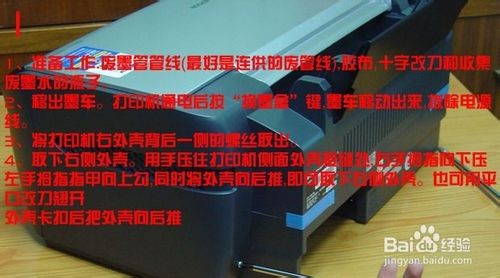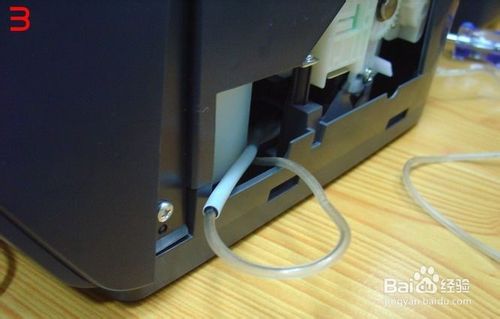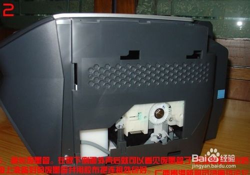 5、接長廢墨管。在取下側面外殼后就可以看見廢墨管了,把廢墨管拔出后接上準備好的廢墨管并用膠布把連接處包好。