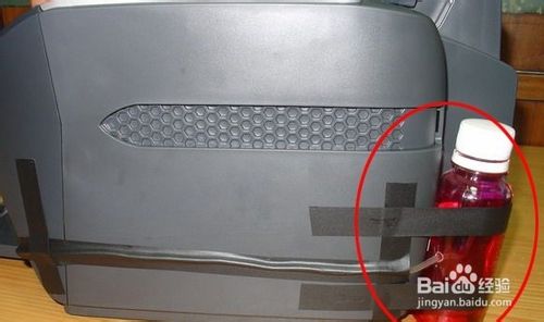 7、把廢墨管線插入廢墨瓶中。用膠帶將穿出打印機的廢墨管粘貼在外殼上,最后插入準備好的廢墨瓶中,再將廢墨瓶進行固定。廢墨管引出和插入廢墨瓶的整個位置高度一般不要高于打印機內部的噴嘴,以免廢墨倒灌。