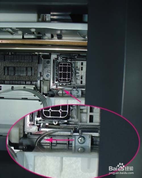 6、廢墨管線引出打印機廢墨管引出和插入廢墨瓶的整個位置高度一般不要高于打印機內部的噴嘴,以免廢墨倒灌。 如果不損壞打印機外殼,可以將連接好后的廢墨管線從打印機內部經過托紙板右側穿出來,管線再從打印機右面繞到打印機后面。