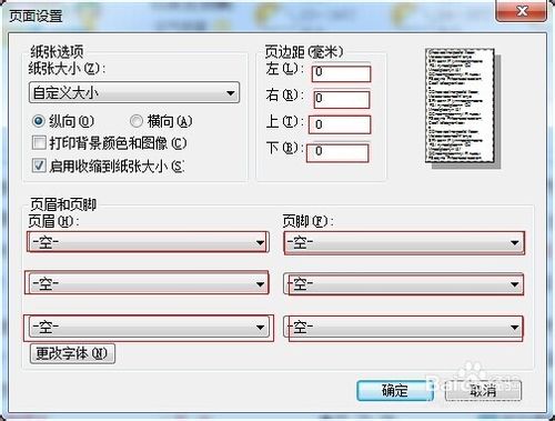 3、第三點,有時候我們打印機的頁面設置里面設置編輯或者是頁眉頁腳的設置對打印機紙的長短也有影響。這個可以在瀏覽器打印設置界面里看到。設置如下: