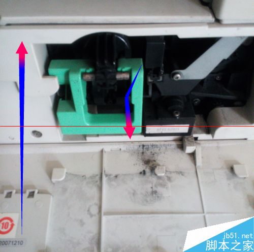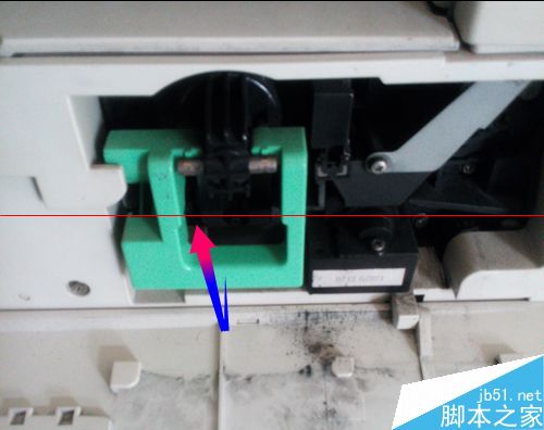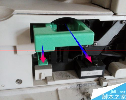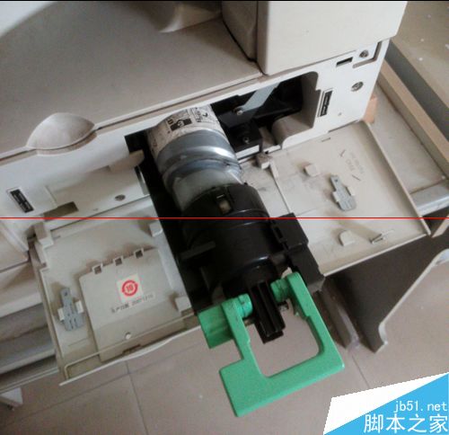 2、打開翻蓋,醒目位置那個就是裝碳粉的瓶子組件,首先把綠色的把手往上提,把組件解鎖