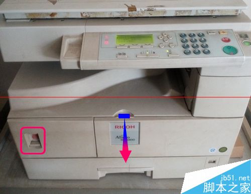 1、添加碳粉前,記得關閉復印機電源哦,面對復印機正面,把中間的前蓋翻下來