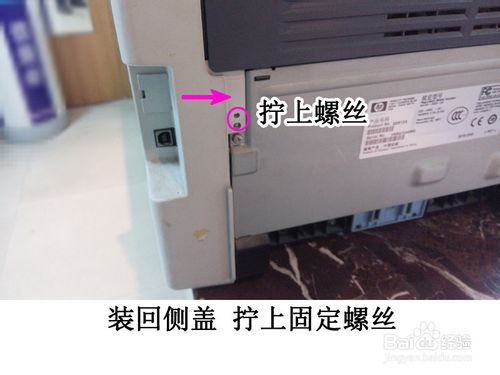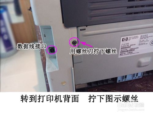 3、然后將打印機(jī)背面朝向自己,在左側(cè)打印機(jī)數(shù)據(jù)線接口附件找到圖示螺絲,并用準(zhǔn)備好的十字螺絲刀擰下螺絲