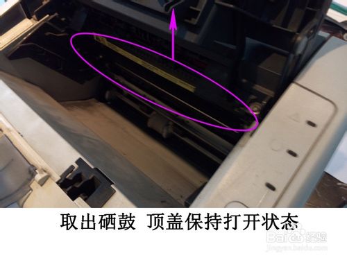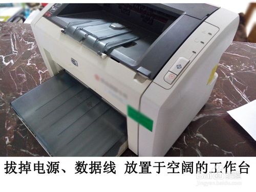 2、然后我們把故障打印機(jī)拔掉電源線、打印數(shù)據(jù)線,放到比較空闊的工作臺上。取出硒鼓