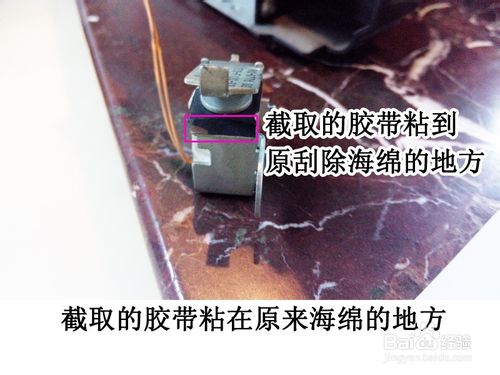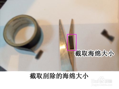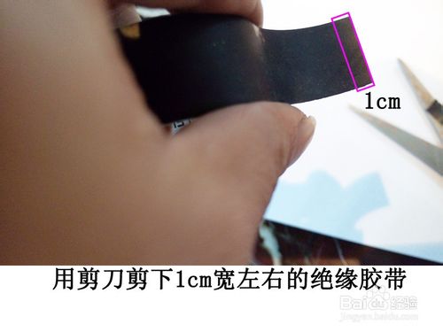 7、然后用剪刀剪下寬度約1cm左右的絕緣膠帶,長度截去少許,大小等同第6步刮去的海綿大小