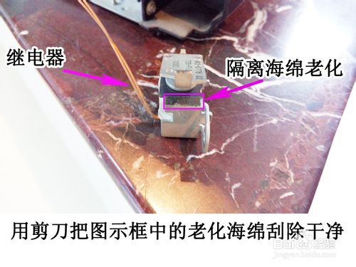 6、用剪刀把繼電器上面的那層已經(jīng)老化、失去功效的海綿刮除干凈