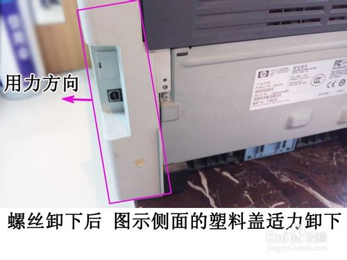 4、上一步的圖示黑螺絲擰下后,左面的側(cè)蓋朝下圖示用力方向適力卸下