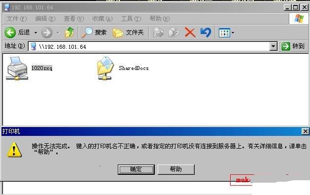 2,但是點擊下一步的時候破天荒的出現了報錯對話框:操作無法完成.鍵入的打印機名不正確,或者指定的打印機沒有連接到服務器上…… 如下圖所示:
