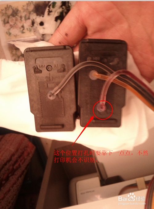 把墨盒上端打孔,注意位置,尤其是【彩色墨盒上面那個(gè)孔】要略微靠下一點(diǎn),然后根據(jù)長(zhǎng)度把管線截好。插入孔內(nèi),我的已經(jīng)做好就不一個(gè)一個(gè)看了。