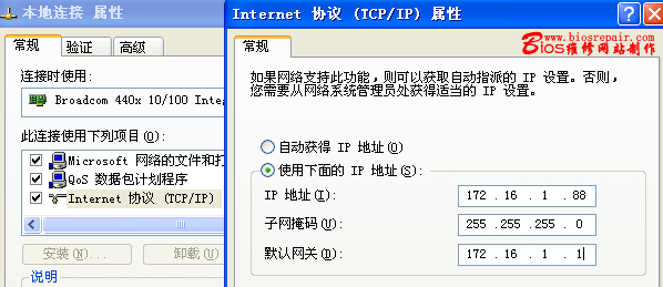 然后在當前電腦網卡屬性中,將IP地址修改為172.16.1.X (X取自然數范圍2—254),如下圖: