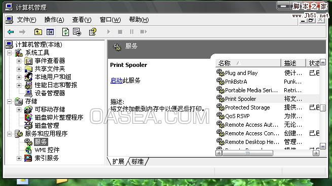 在“管理”窗口中,選取“服務(wù)和應(yīng)用程序”擴(kuò)展項(xiàng)目下的“服務(wù)”選項(xiàng),在右側(cè)出現(xiàn)系統(tǒng)服務(wù)列表中找到“Print Spooler”服務(wù),雙擊進(jìn)入“Print Spooler”服務(wù)設(shè)置;