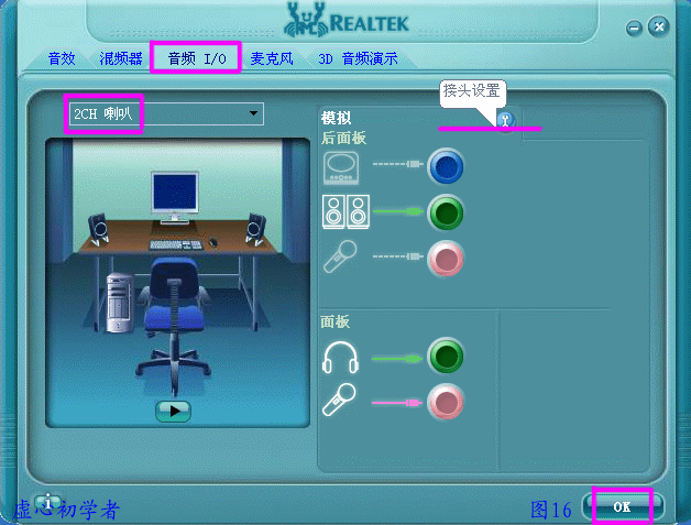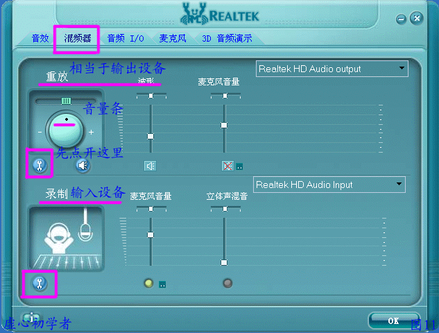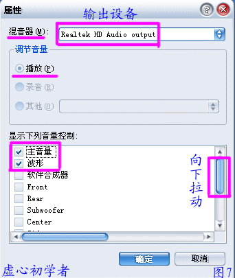 第七步: 選擇“混音器”里面的“ output”,即輸出設備。把“主音量”、“波形”,