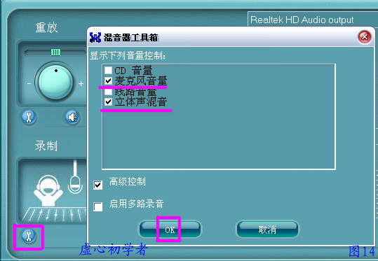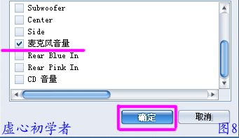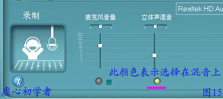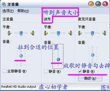 第九步: 調節(jié)各個音量拉條到合適的位置上,注意:麥克風音量下的“靜音”選項,如果正常說話是點上,如果放歌曲的時候要去掉。