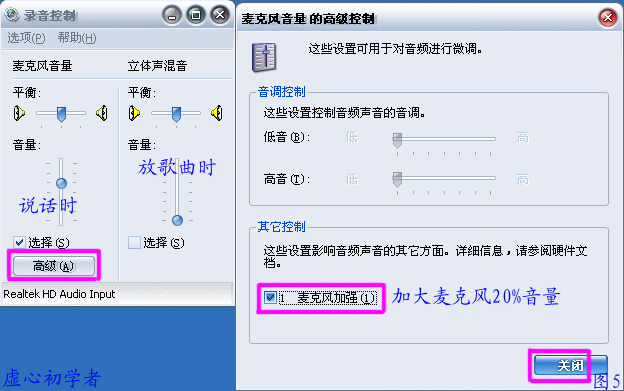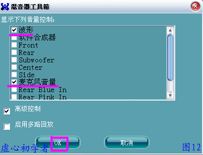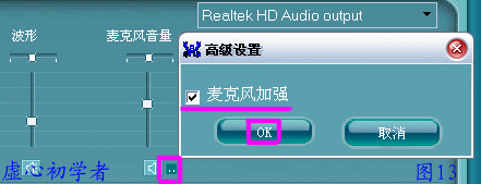 第五步: 點擊“麥克風”下面的“高級”按鈕,把“麥克風加強”打上勾。
