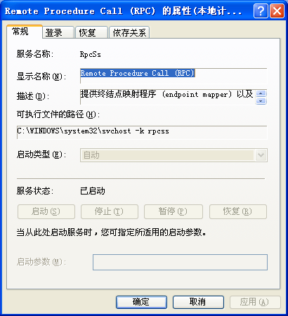 單擊該設置窗口中的“常規”標簽,打開如圖2所示的標簽頁面,在該標簽頁面中我們發現“Remote Procedure Call”服務默認狀態為已啟動,該服務的啟動類型為“自動”,使用的服務登陸方式為“本地系統”。一般來說,為了確保RPC系統服務能隨Windows系統的啟動而自動開啟,我們應該嘗試將該服務的啟動類型修改為“自動”。要是在圖2所示的標簽頁面中,我們發現“Remote Procedure Call”服務默認狀態顯示為禁用的話,我們就有必要將該服務重新啟動起來;啟用該服務時,只需要單擊“常規”標簽頁面中的“啟動”按鈕,RPC服務就能被自動開啟了,同時為了保證該服務下次能自動啟用,我們一定不要忘了將該服務的啟動類型設置為“自動”。需要提醒各位的是,計算機系統除了提供“Remote Procedure Call(RPC)”系統服務外,還為我們提供了一個名為“Remote Procedure Call(RPC)Locator”的系統服務,該系統服務其實是遠程過程調用定位服務,該系統服務由于沒有缺省值,因此需要我們手動進行配置,具體配置的步驟幾乎與“Remote Procedure Call”服務一致。