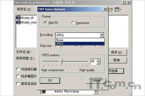 1 我們現(xiàn)在的驅(qū)動(dòng)SW5提供帶JPG壓縮功能的TIF格式掃描,就是在存盤的時(shí)候,有選項(xiàng)可以選擇,如下: