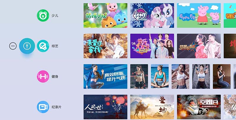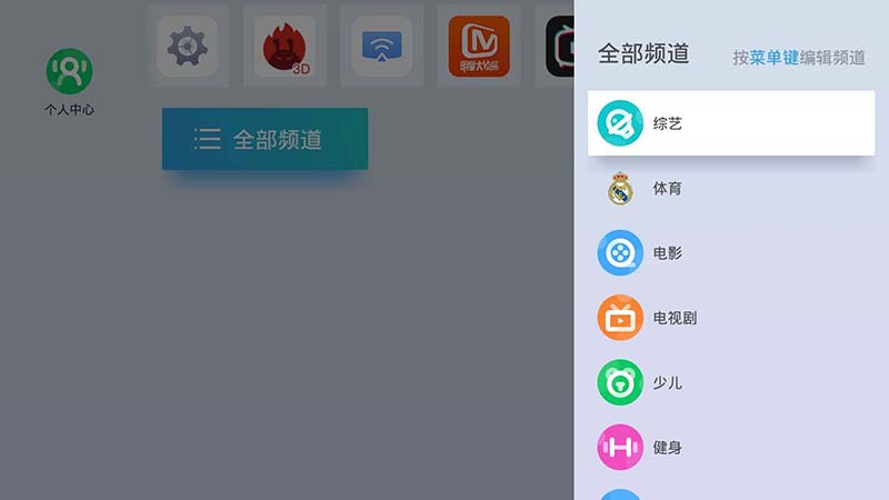 如果各位對“綜藝”比較喜歡我們就可以按住遙控器的左鍵,直到出現(xiàn)圖中的標(biāo)。“箭頭”是把這個模塊移到第一位的意思;“圈”是刪除的意思。