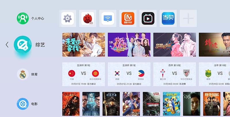 當(dāng)貝投影F1的UI界面最干凈的時刻。添加應(yīng)用點擊“➕”。