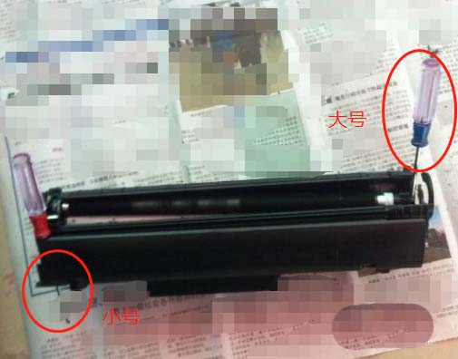 2、然后用十字螺絲刀拆掉硒鼓側面的兩顆螺釘,如圖所: