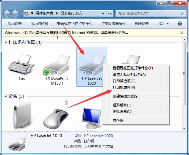 3、在打開的窗口中找到打印機右擊鼠標,在彈出的菜單中點擊打印機屬性(P)。
