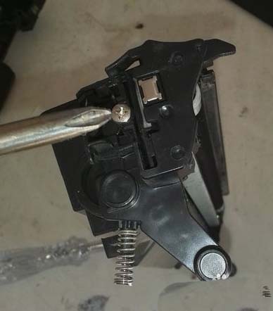 1、硒鼓的有齒輪的一頭有一個緊固的螺絲,把他擰下來,再拿下螺絲所固定的一個小蓋子