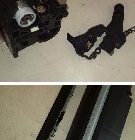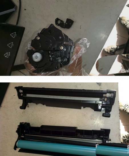 4、拿下磁輥固定蓋子后,有帶簡易加粉口的就可以打開塞子加粉了,沒有簡易加粉口的要輕輕的拿下磁輥在磁輥的下方注入墨粉。