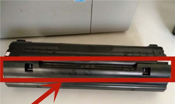 2、將粉盒裝入打印機(jī)之前,要記得把硒鼓保護(hù)蓋卸下。方法:沒有螺絲,順著開口方向(圖中箭頭方向)兩端同時用力拉動即可直接取下。
