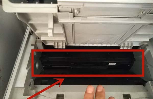4、雙手分別抓住圖標(biāo)兩處地方,向上掀開送紙板,讓送紙板和打印機(jī)上蓋結(jié)合一處,下邊留出較大空隙,露出舊墨盒。