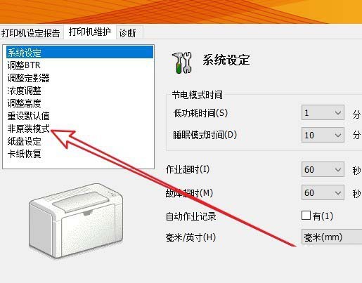 6、在打開的打印機維護窗口中,點擊“非原裝模式”菜單項。