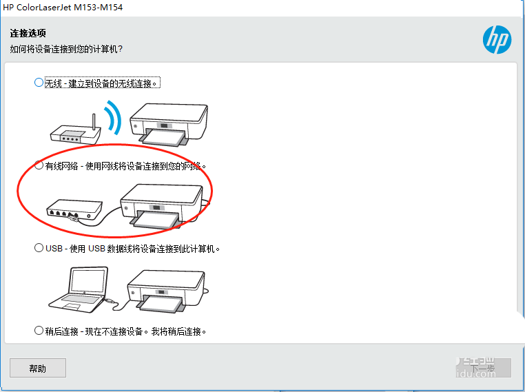 6、選擇“有線網線-使用網線將設備連接到您的網絡”,鼠標單擊“下一步”,進入下一安裝步驟。