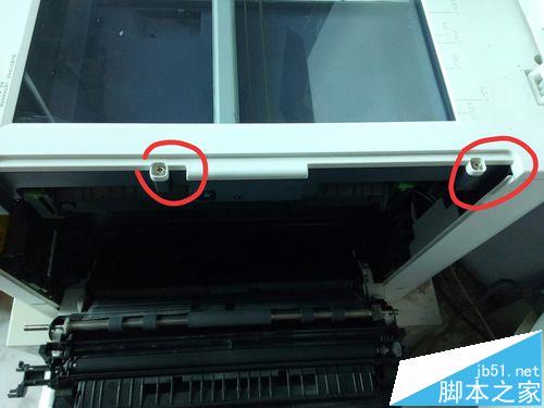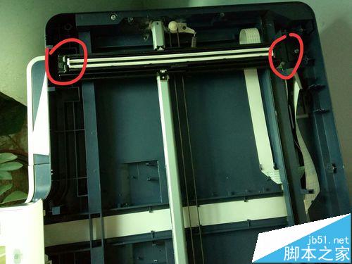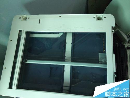 5、將機(jī)器上面的玻璃面板慢慢拿下來(lái),找個(gè)安全的地方放好,掃描架就露出來(lái)了。在T型掃描架的兩側(cè),這二個(gè)紅色的地方下面的滑道,用棉簽蘸些縫紉機(jī)油涂抹在滑道上,中間滑道也涂些,不用涂太多,能起到潤(rùn)滑作用就可以了。