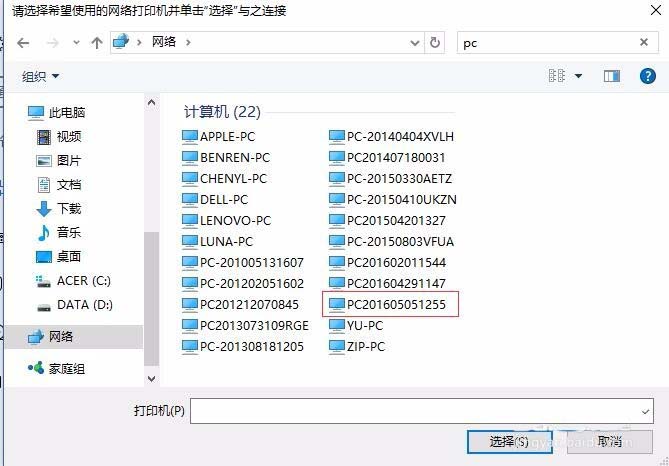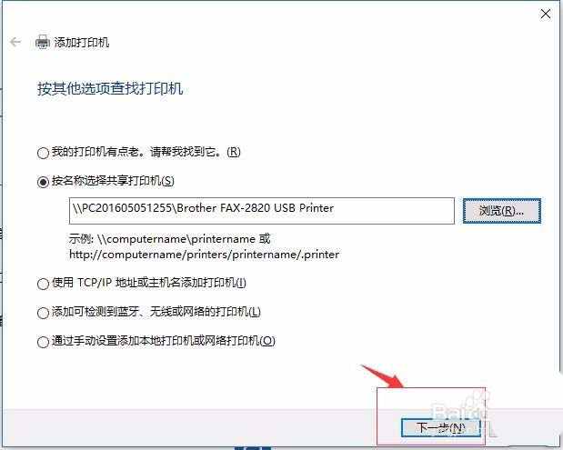 3、在B電腦上操作,控制面板中,添加打印機,點擊“我需要的打印機不在列表中”,選擇“按名稱選擇共享打印機”—點擊“瀏覽”, 找到A電腦PC201605051255