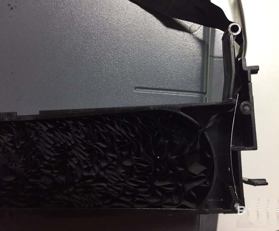 4、打開色帶架,將色帶架中舊色帶倒掉。注意要小心,防止色帶架中齒輪等零件掉落。后將色帶盒正面擺放