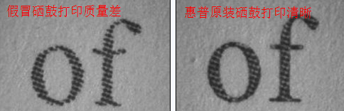 惠普原裝硒鼓打印出來的圖像、文本細膩清晰,而且原裝硒鼓的鼓粉附著力強,打印在紙上有突出紙面的感覺。而假冒硒鼓或灌裝硒鼓填充的鼓粉質量參差不齊,和原裝鼓相比打印質量差,不清晰,甚至可以用手擦掉,附著力差。