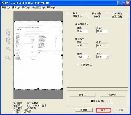 5、在“HP LaserJet M1210nf MFP TWAIN”窗口中,您可以預覽并且簡單編輯掃描的稿件,然后點擊“接受”按鈕。