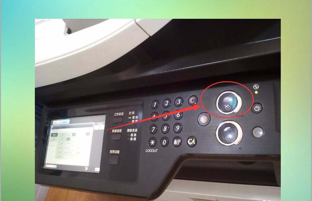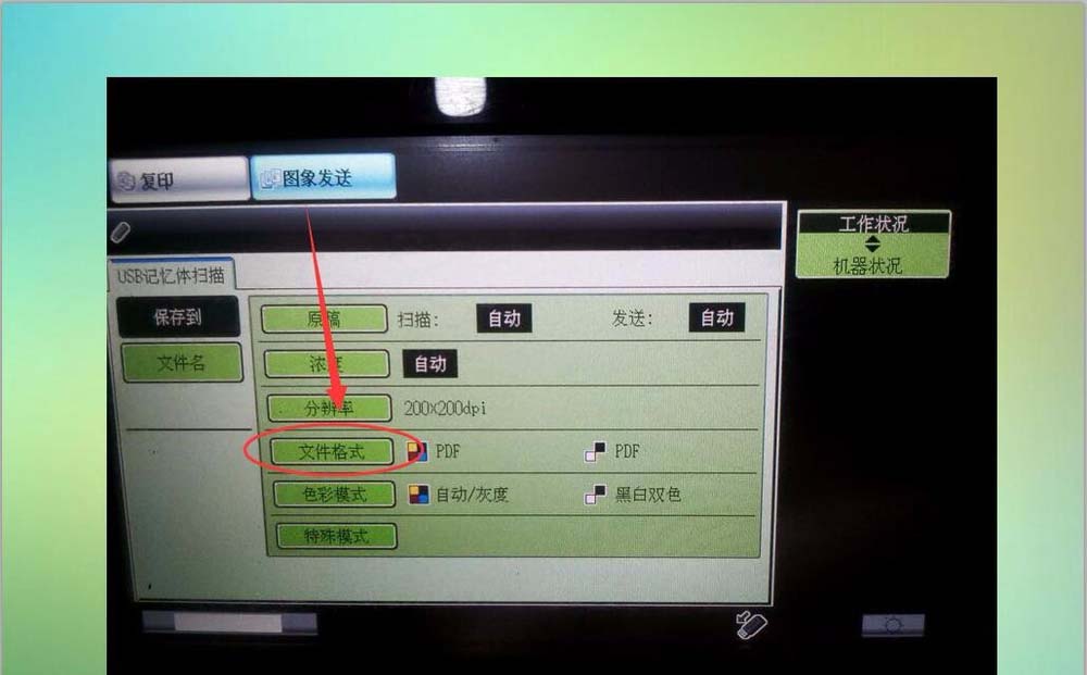 5、將文件放到掃描的位置,紙張的大小根據(jù)自己的要求,一般都是放到A4的位置上進(jìn)行掃描。按下右面的圓形按鈕(彩色圖像發(fā)送)進(jìn)行圖像發(fā)送到U盤,下面的按鈕發(fā)送的是黑白的,具體根據(jù)自己的要求操作。