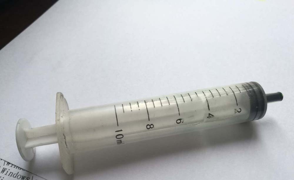 3、再打開小車噴頭蓋,將不缺墨的孔用紙巾塞住,完成后,將針筒對(duì)準(zhǔn)缺墨的孔,同時(shí)將缺色那個(gè)墨盒蓋放下(蓋子不下吸不動(dòng)的),用針筒將墨吸上即可。