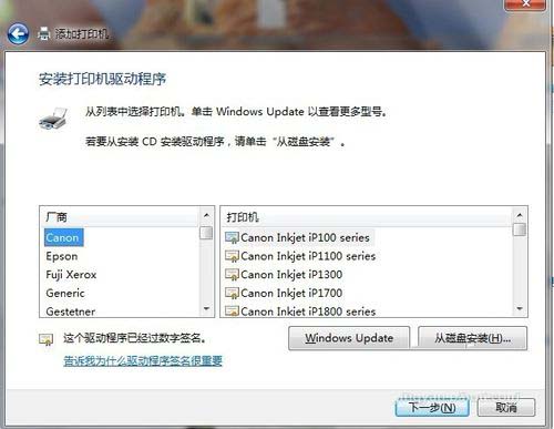 7、在選項列表內選著打印機的品牌和型號,如果你有光盤的話就用隨機附送的光盤直接安裝打印機的驅動系統,如果沒有的話,那就到該品牌的官方網站下載這個型號的打印機驅動就行,按照它的提示一步一步安裝就行了。