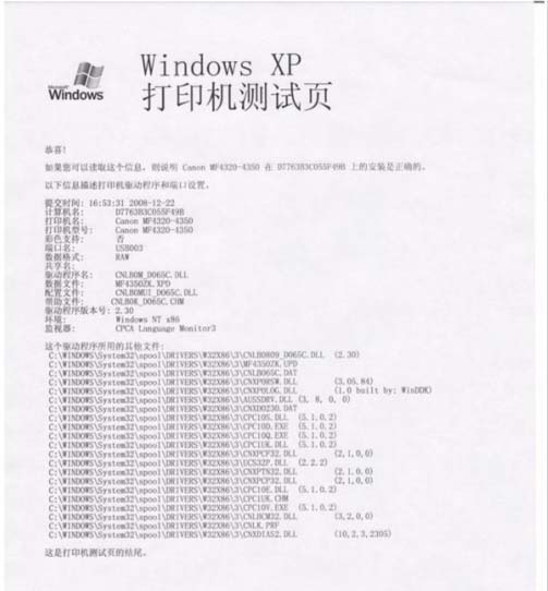 5、如果打印機與電腦正常連接,這樣就會通過打印機打出測試頁,測試頁上的信息包含打印機的名稱及參數等信息。