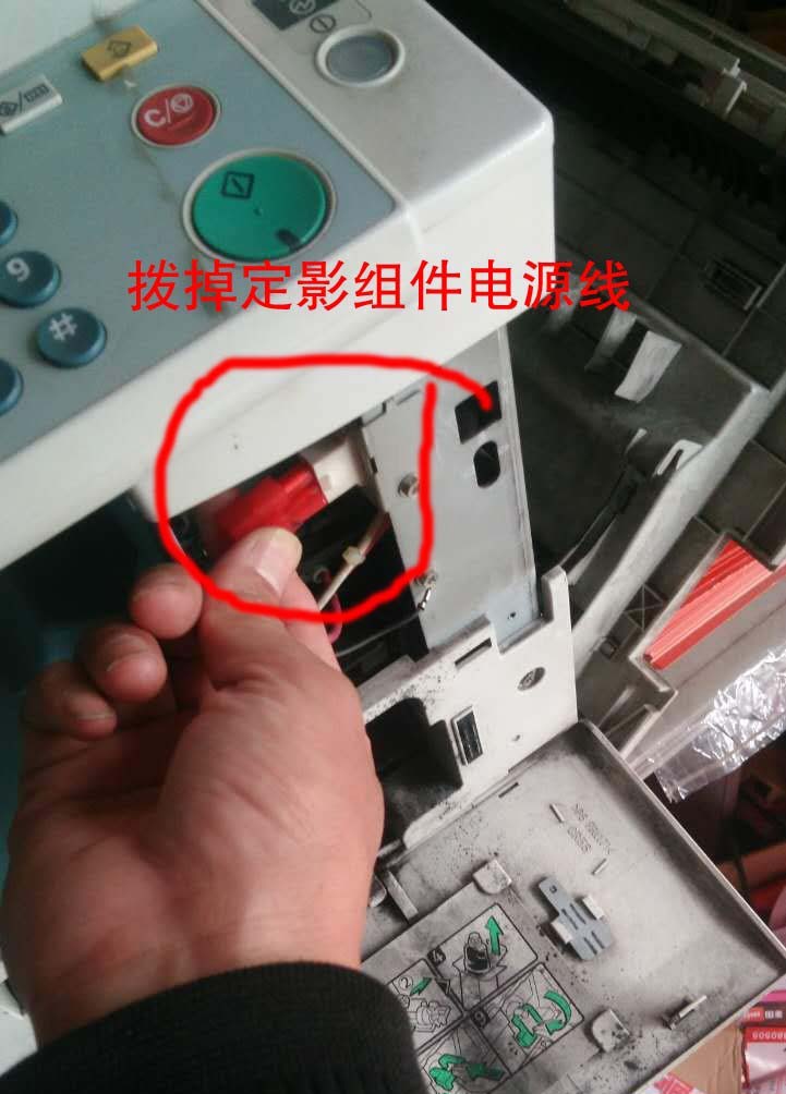6、拉開后,可以看見紅圈內紅色插頭,這個定影組件的電源插頭,撥掉它。