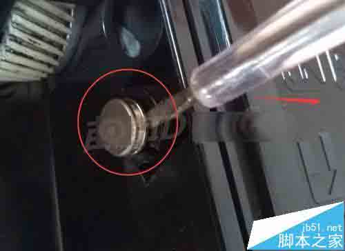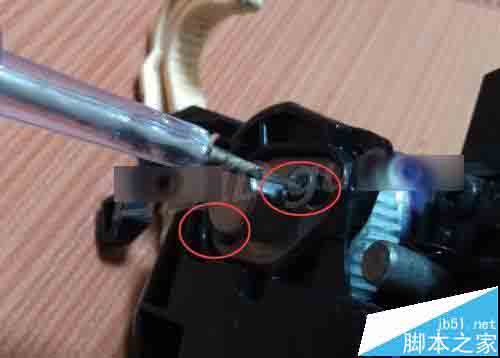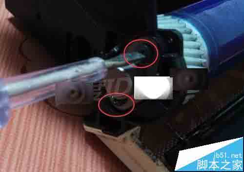 2、再將感光鼓兩頭的固定銷釘?shù)穆萁z用小的一字螺絲刀旋下來
