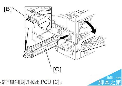 2、打開右側門,捏下鼓單元下面的塑料卡扣,即下取下整個PCU單元