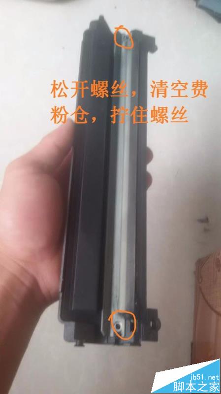 1、打開粉倉,取出硒鼓,如圖,然后松開硒鼓上的兩顆螺絲。如圖。