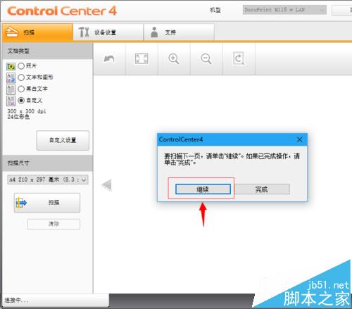 6、在連續(xù)掃描的工作狀態(tài)下,當(dāng)一頁(yè)掃描完成后,出現(xiàn)如下窗口,放入下一頁(yè),點(diǎn)擊繼續(xù)選項(xiàng),或者是直接點(diǎn)擊完成選項(xiàng),結(jié)束掃描的過(guò)程。