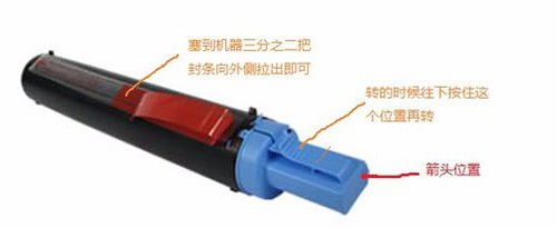 4、打開機器前蓋,會看到藍色的墨粉筒把手,仔細看把手上會有個箭頭,墨粉筒旁邊有兩個小鎖圖標,正常情況下墨粉筒上的箭頭指向小鎖圖標的鎖死位置,按下墨粉筒的把手用力向開鎖位置旋轉,直至墨粉筒的箭頭指向開鎖位置,用力向外拉,將墨粉筒抽出。此時進行墨粉更換:佳能復印機原裝的墨粉會有個黃色的封條,封條上有箭頭。封條方向在上,將墨粉向粉桶里塞,塞到約三分之二的位置時將封條向正前方抽出,之后把墨粉筒推到底,旋轉直到鎖死的位置,關上墨粉筒前蓋,完成