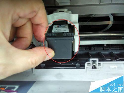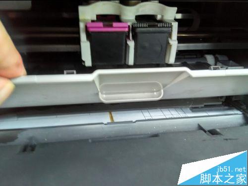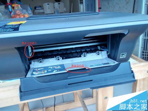2、打開(kāi)白色的墨盒檔蓋,如圖中畫(huà)圈處往外扳開(kāi);此時(shí)看到墨盒架隱藏在了左側(cè)角落處