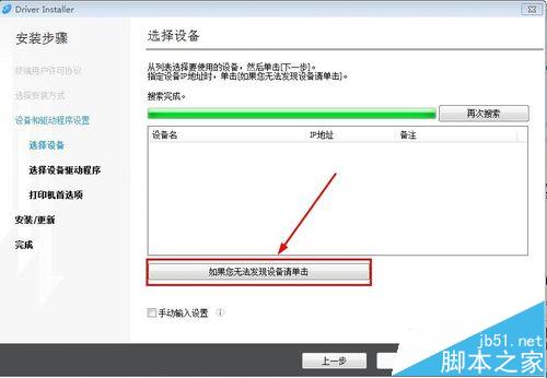 2、在選擇設備界面,點擊下方的“如果您無法發現設備清單請點擊”,在選擇搜索方式界面選擇“指定設備IP地址”,然后點擊下一步