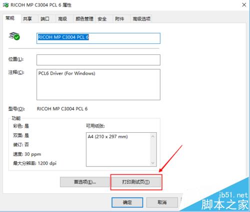 5、在電腦桌面左下角:點擊開始--控制面板--查看設備和打印機;選中RICOH MP C3004 PCL6,右鍵點擊“打印機屬性”,點擊打印測試頁,如果正常打印,則代表打印機安裝打印成功。