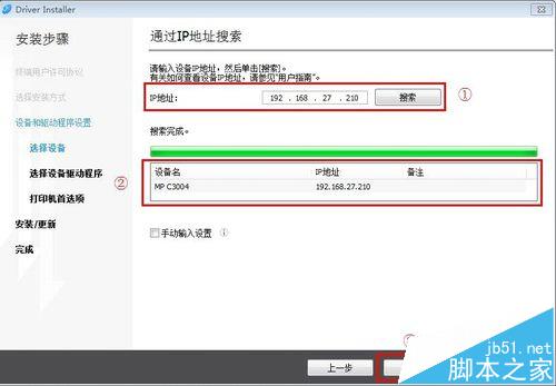 3、在通過IP地址搜索界面輸入打印機IP地址,例如:192.168.27.210 ,點擊搜索,搜索完成后選擇MP C3004后點擊下一步