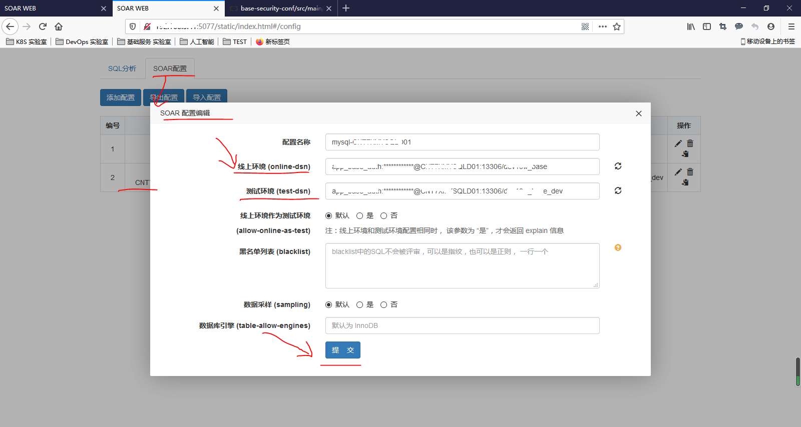 # install servermv /opt/soft/soar/soar /opt/install/soar # 目錄介紹:# 配置文件為yaml格式。一般情況下只需要配置online-dsn, test-dsn, log-output等少數幾個參數。即使不創建配置文件SOAR仍然會給出基本的啟發式建議。# 默認文件會按照/etc/soar.yaml, ./etc/soar.yaml, ./soar.yaml順序加載,# 找到第一個后不再繼續加載后面的配置文件。如需指定其他配置文件可以通過-config參數指定。# 關于數據庫權限online-dsn需要相應庫表的SELECT權限,test-dsn需要root最高權限。 # 修改默認配置參數,如下# 參考# # 1. 修改soar.conf的基本參數root >> cat > /opt/install/soar/conf/soar.yaml << EOF# 線上環境配置online-dsn: addr: CNT7XMYSQLD01:13306 schema: sakila user: root password: 1t'sB1g3rt disable: false# 測試環境配置test-dsn: addr: CNT7XMYSQLD01:13307 schema: test user: root password: 1t'sB1g3rt disable: false# 是否允許測試環境與線上環境配置相同allow-online-as-test: true# 是否清理測試時產生的臨時文件drop-test-temporary: true# 語法檢查小工具only-syntax-check: falsesampling-statistic-target: 100sampling: false# 日志級別,[0:Emergency, 1:Alert, 2:Critical, 3:Error, 4:Warning, 5:Notice, 6:Informational, 7:Debug]log-level: 7log-output: ${SOAR_LOG_DIR}/soar.log# 優化建議輸出格式report-type: markdownignore-rules:- ""# 黑名單中的 SQL 將不會給評審意見。一行一條 SQL,可以是正則也可以是指紋,填寫指紋時注意問號需要加反斜線轉義。blacklist: ${SOAR_CONF_DIR}/soar.blacklist# 啟發式算法相關配置max-join-table-count: 5max-group-by-cols-count: 5max-distinct-count: 5max-index-cols-count: 5max-total-rows: 9999999spaghetti-query-length: 2048allow-drop-index: false# EXPLAIN相關配置explain-sql-report-type: prettyexplain-type: extendedexplain-format: traditionalexplain-warn-select-type:- ""explain-warn-access-type:- ALLexplain-max-keys: 3explain-min-keys: 0explain-max-rows: 10000explain-warn-extra:- ""explain-max-filtered: 100explain-warn-scalability:- O(n)query: ""list-heuristic-rules: falselist-test-sqls: falseverbose: trueroot >> EOF step 3: 準備環境變量# env parameter and pathecho '' >> /etc/profile && /echo 'SOAR_HOME=/opt/install/soar' >> /etc/profile && /echo 'SOAR_CONF_DIR=$SOAR_HOME/conf' >> /etc/profile && /echo 'SOAR_LOG_DIR=$SOAR_HOME/log' >> /etc/profile && /echo 'PATH=$PATH:$SOAR_HOME' >> /etc/profile && /source /etc/profile step 4: 文件賦予權限chmod -R 777 $SOAR_HOME/soar step 5: 檢查soar全局配置生效# 查看版本soar -version # 打印所有的啟發式規則soar -list-heuristic-rules # 打印支持的報告格式soar -list-report-types二 、soar-web主要步驟,如下: